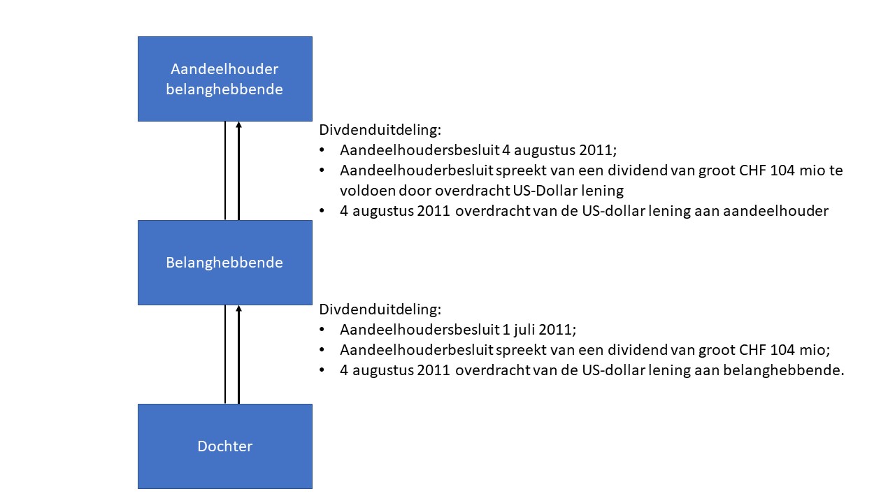 5.3.2. Vast staat voorts dat de aandeelhouders van belanghebbende op 4 augustus 2011 hebben besloten dat belanghebbende aan de aandeelhouders een dividend uitkeert van CHF 104.000.000 en dat het bestuur van belanghebbende daaraan op 4 augustus 2011 goedkeuring heeft gegeven (uitspraak rechtbank onder 9). Dit betekent dat [A] uit hoofde van deze besluiten op 4 augustus 2011 een recht op dividend ter grootte van CHF 104.000.000 heeft verkregen en dat belanghebbende op die datum de betaling van een evenzo groot bedrag als dividend aan [A] schuldig is geworden.