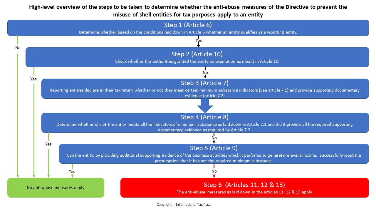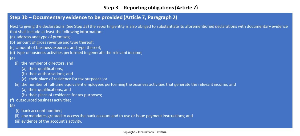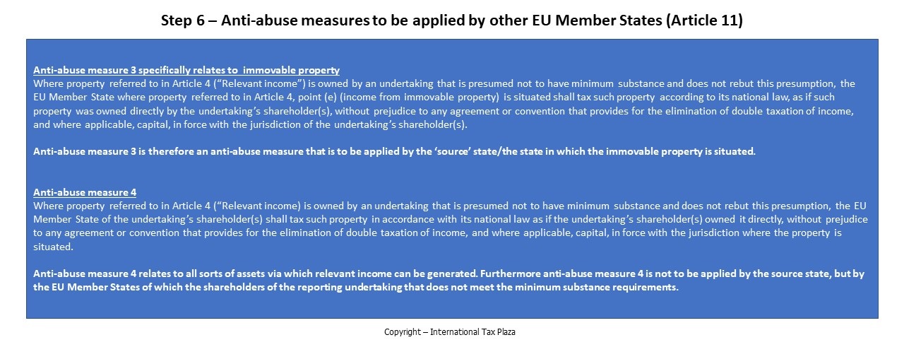 An undertaking that declares not to meet one or more of the indicators set out in Article 7, Paragraph 1 or that does not provide satisfactory supporting documentary evidence in accordance with Article 7, Paragraph 2 shall be presumed not to have minimum substance for the tax year. So does this mean that the anti-abuse measures apply to the reporting undertaking for the tax year? No, in that case we move forward to step 5.