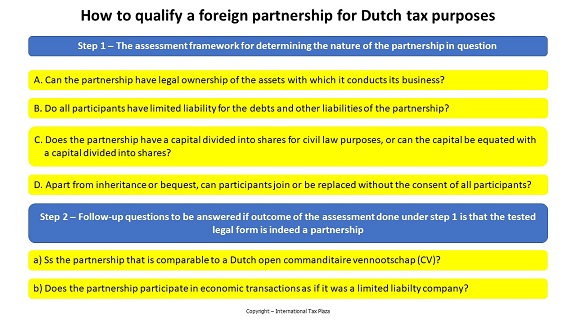 In its considerations the Dutch tax authorities have described the steps that have to be taken when assessing how a foreign partnership qualifies for Dutch tax purposes. In this article we discuss these steps, so that our readers get a better understanding on how to assess whether or not a foreign partnership qualifies as a transparent partnership for Dutch tax purposes.